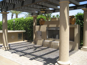 Sites are gathered around 3 to 4 putting greens. Members can put 18 holes. Each site can be improved by the owner. Many add outside grilles, fireplaces, lighting, etc. Our site had lots of improvements — a full kitchen with dishwasher, refrigerator, oven and cook top. Next to it was a sort of lanai with a gas fireplace and ceiling fan.