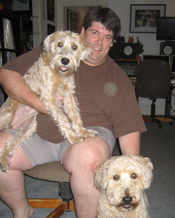 Andy has always shared Gabriel (aka Gabe on the right), with Eric. Now Gabe lives with Eric, who has taken on another Wheaten Terrier — a young lady rescue named Tatum. She has won everyone's hearts. Gabe's opinions are still out. The picture on the right is Andy picking out Gabe (or vice versa), in 2002.