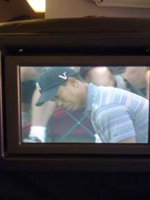The two flights — one to Houston, then Houston to Tampa — were great. On the second leg the plane had TVs in the back of the seat, and Ken got to watch the masters. The picture quality was great. The picture on the right below is the back of the seat when we didn't have video. Remember when planes had phones on them? You can still see the image of where the phone had been. Such old technology now.