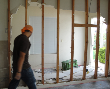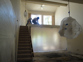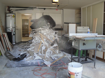 Ken's office was odd. Someone early on had added a 13x11 room, exited with a set of sliders. Then they built a 5 ft. wide room at the end of it, with the only entrance from outside. It seemed to be just an outside storage room, but it had a window onto the patio. So, we had the wall torn down and now the room is 13x18. Left below are the joists left after the wallboard was removed. You can see the outside door, and the window (covered). After all the wall was gone, they covered up the door so it no longer exists.
