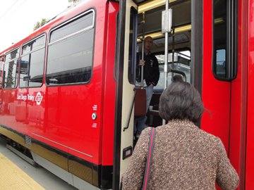 Right: Getting on the trolly in the city.