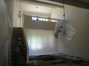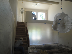 A local company called Staircrafter and its owner Gregg Kuzara and team began the dismantling. The stair wall and loft walls came down. We decided on maple wood railings with black wrought iron balusters with a curly pattern similar to the musical treble clef (we're going to put the piano up on the loft). The steps would be wood with grit added to make them slip-safe. Gregg made the step a little longer so that Ken's big feet would fit. The last thing they did was to apply a germ preventor to the hand rails. This stuff will last two years, according to Gregg. It's a new technology that is being used in hospitals, and he included it at no cost to us.