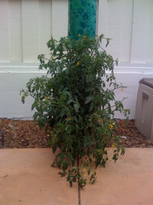 In the last chapter you saw pictures of the upside-down-tomato growing device. Actually, they did pretty well. They started to drag on the patio so we had to tie them up.