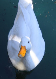 We bought some duck food and found a ready and willing audience. The one to the left would paddle hard to get sort of upright, then catch anything I could throw to it. Better by far than my dog, in terms of accuracy.