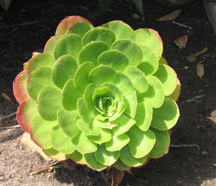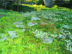 Monday was a day of leisure, before our trip home. Ken and I wandered the property. There were tons of the plants to the right. I tried to look it up and the closest I could come was something called echeveria. The picture to the right is the top view of a very tall hedge, laced with spider webs with early morning dew.