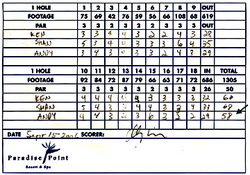 We played the 18-hole putting course (1305 ft., par 50). As you can see from the scorecard on the left, Andy was the big winner, with 58 strokes. I was low person, and got a whole lot of "gimmies" that I didn't deserve. (They were kind to me.)