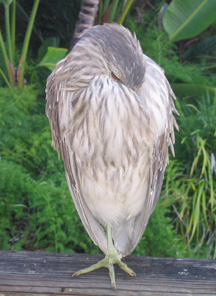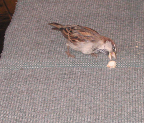 I have no idea what some of these birds are. The one to the lower right is (probably) a very big seagull. And the one on the left was sleeping, with one eye on the camera person. Ken put a little meal out for the tiny wren, on the seat at our table.