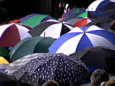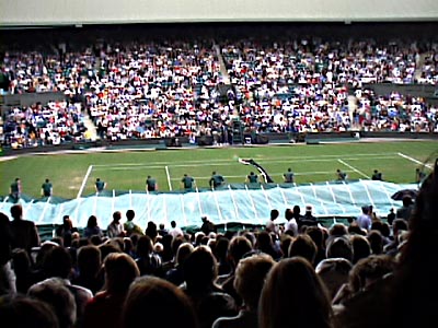 | There was only one short (45 min.) rain delay in the three days we attended. It was amazing how fast the umpire's chair was pushed back, the net lowered to the ground, and the tarp pulled out. | The tarp is still full of air and hasn't settled down on the ground. One year a man was caught underneath and they had to go to some trouble to get him out. | |||||||||||||||