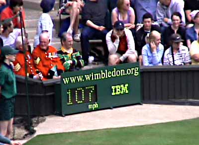 | Stan told us that there is very little advertising on Centre Court, compared to other tournaments. IBM sponsors the service speed board, Rolex sponsors the score board, and Slazinger sponsors the balls and has one small name on the side of the courts. | ||||||||||||||||