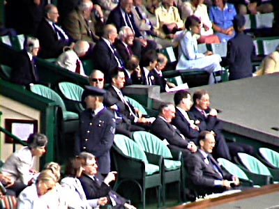 | This demonstration with costumes and flag appeared at the end of each game Henman won. On the right is the Royal box, which has padded, wicker seats. | ||||||||||||||||