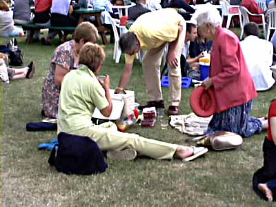 | On the hill people with general admission tickets set up picnics. | They're watching TV on a very large screen. | |||||||||||||||
